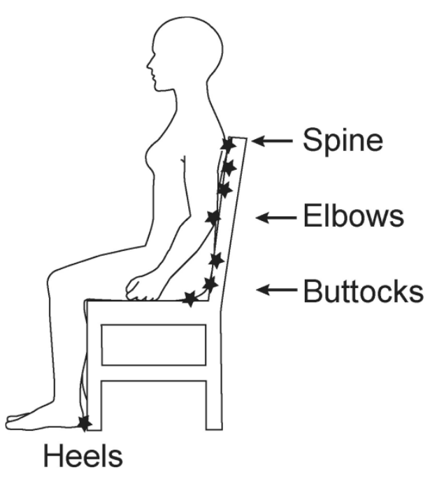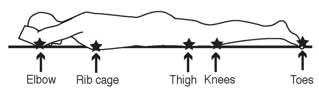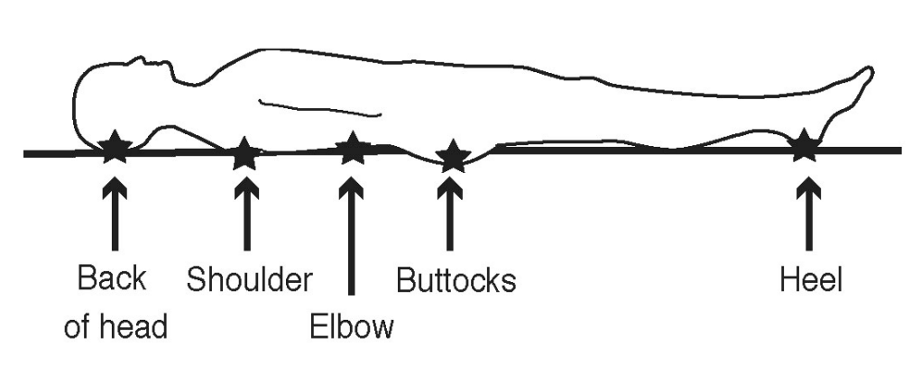 Pressure ulcers occur over areas of the body which support our weight and where bone is near the surface (there is a constant pressure). See diagrams.